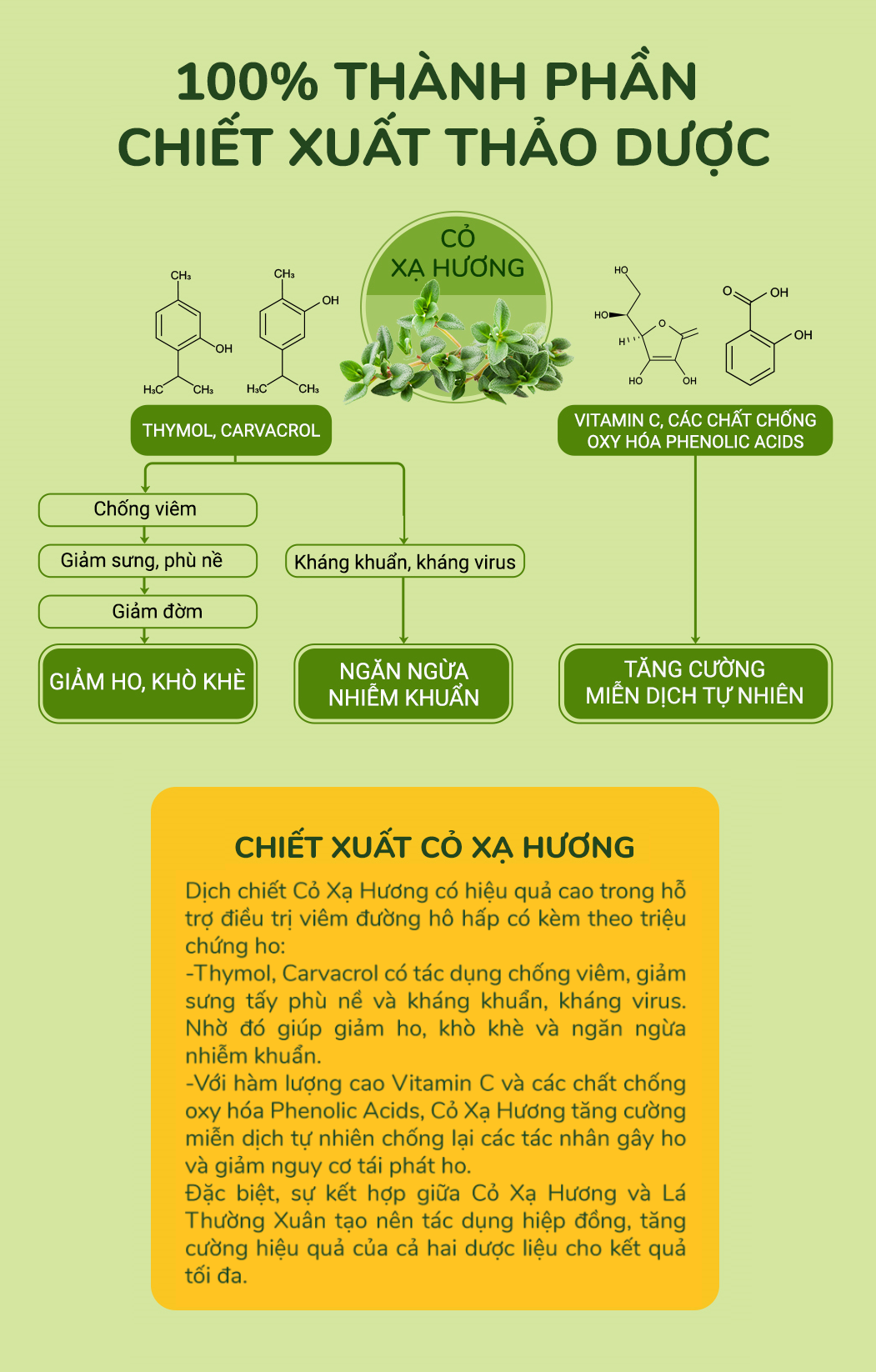 - Dạng siro- Công thức tối ưu cho trẻ trên 2 tuổi và người lớnvới thành phần Cỏ Xạ Hương cao vượt trội- Thơm ngon, dễ uống